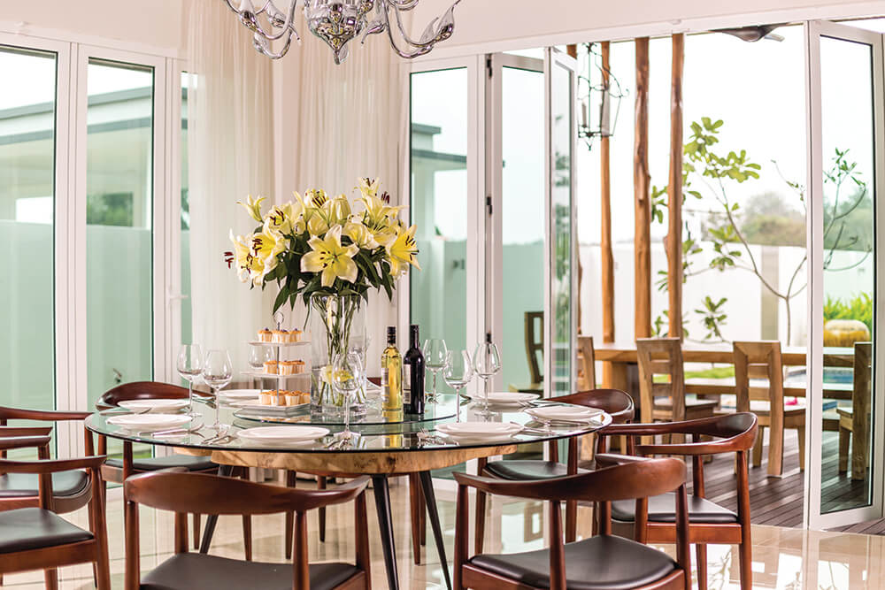 Jambangan bunga bersesuaian indahkan meja makan.